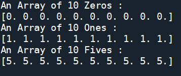 Write a NumPy program to create an arrary of 10 zeros , 10 ones and 10 fives.